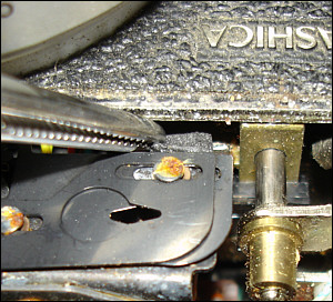 6) Testing the new "Pad of Death." With the new pad in place, press the shutter release. Put the film advance on its post and lightly tighten with your fingers. Advance the crank and watch as the small bracket strikes your new pad. It should make a "thunk." Depress the shutter release and see if it locks into place. You know it will lock, because that tiny bracket that you pushed out of the way should stay down and won't return until you use the film advance.