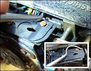 The inset in the lower photos shows the type of tool I used to pull the new pad into place. If you use a paper clip, bend a small portion of the tip so it is a bit less than a 90-degree angle.