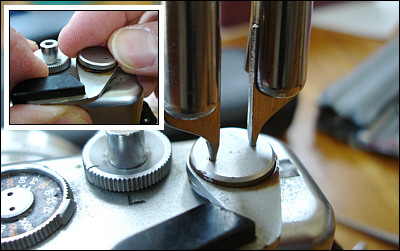 Use the spanner wrench to remove the film speed dial. The trick when reassembling this is to put the pin in the outer dial, turn the outer dial to either its highest or lowest setting and tighten the one with the printed speeds until it lines up with the small hash mark. Firmly hold the film speed dial in place and fully tighen the screw.